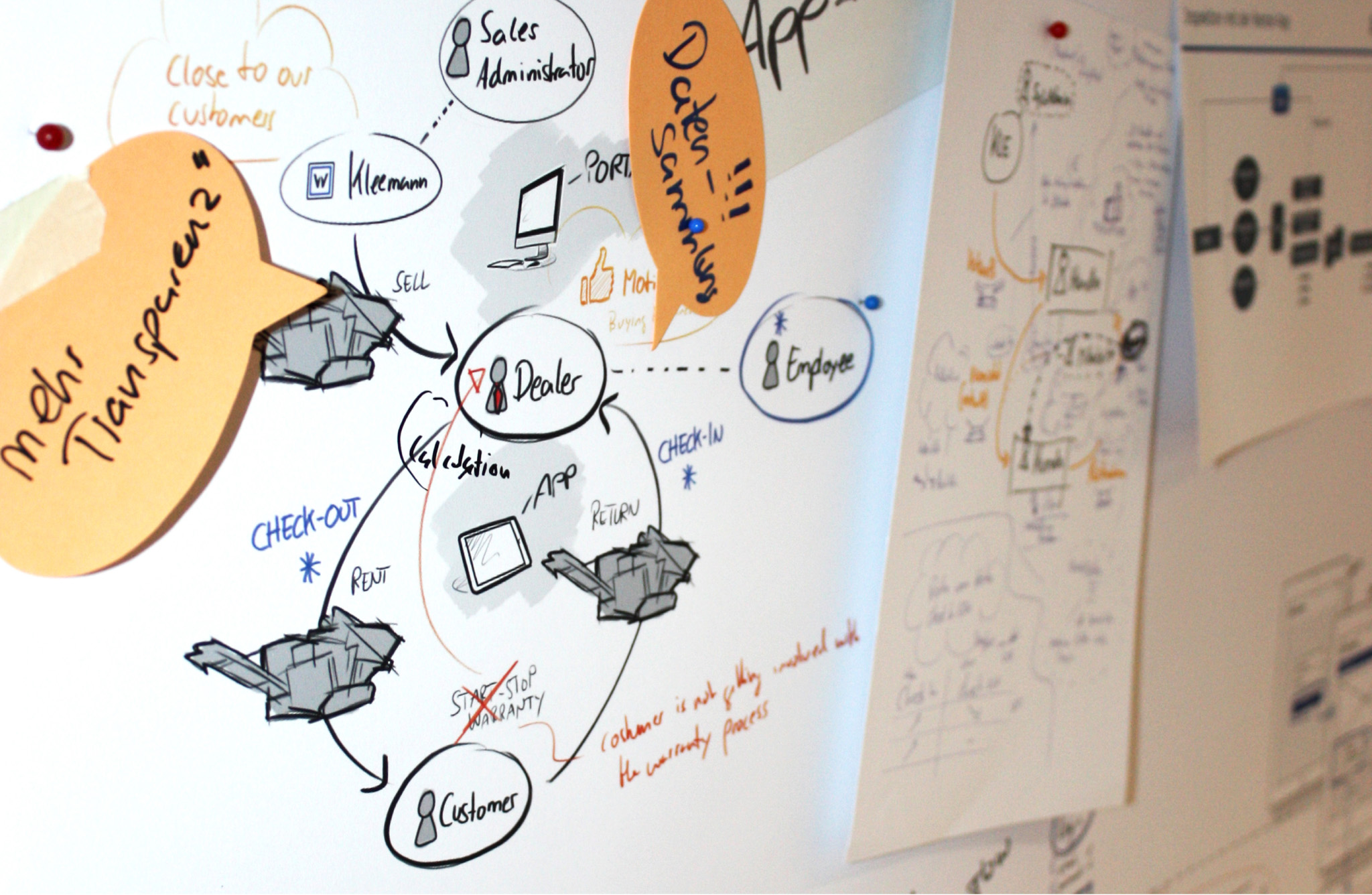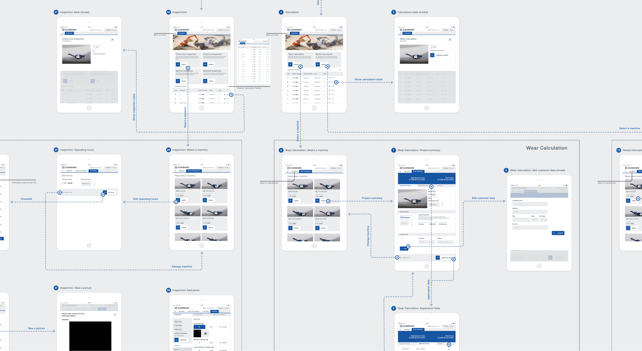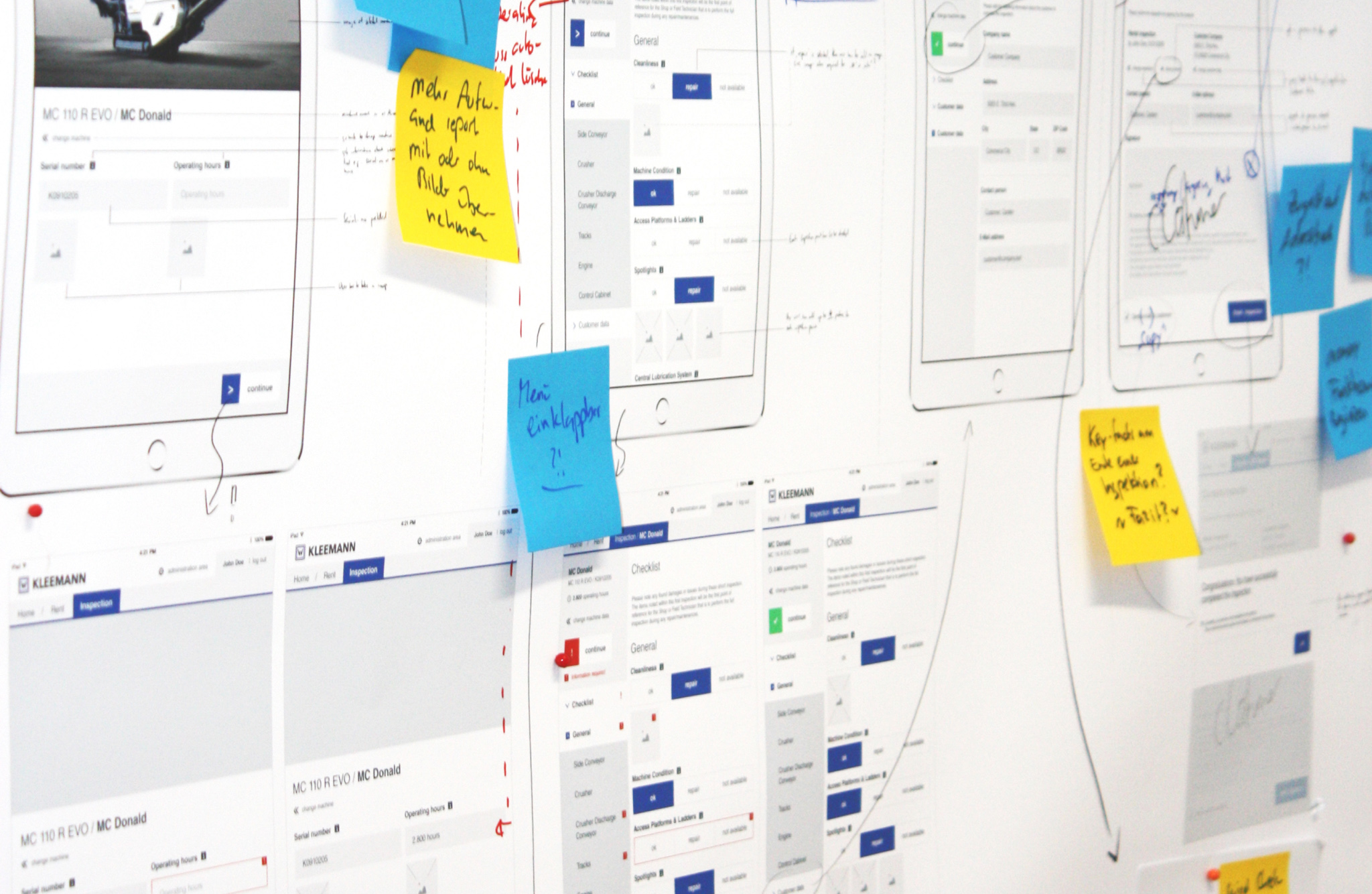 Das Konzept der App entstand iterativ und agil in gemeinsamen Konzeptworkshops im Design Studio in Stuttgart und in Göppingen und im Austausch mit Kunden, Nutzer*innen und Entwicklern. Zunächst noch Scribbles und Wireframes, dann konkreter als Screendesigns und ersten Prototypen. Je konkreter die Vision wurde, umso zahlreicher wurden Ideen und Anforderungen. Diese wurden in einem Ticket-System dokumentiert und für die Umsetzung priorisiert. Scope und Ziel für den ersten Launch der App waren Kleemann Maschinen Händler in den USA.