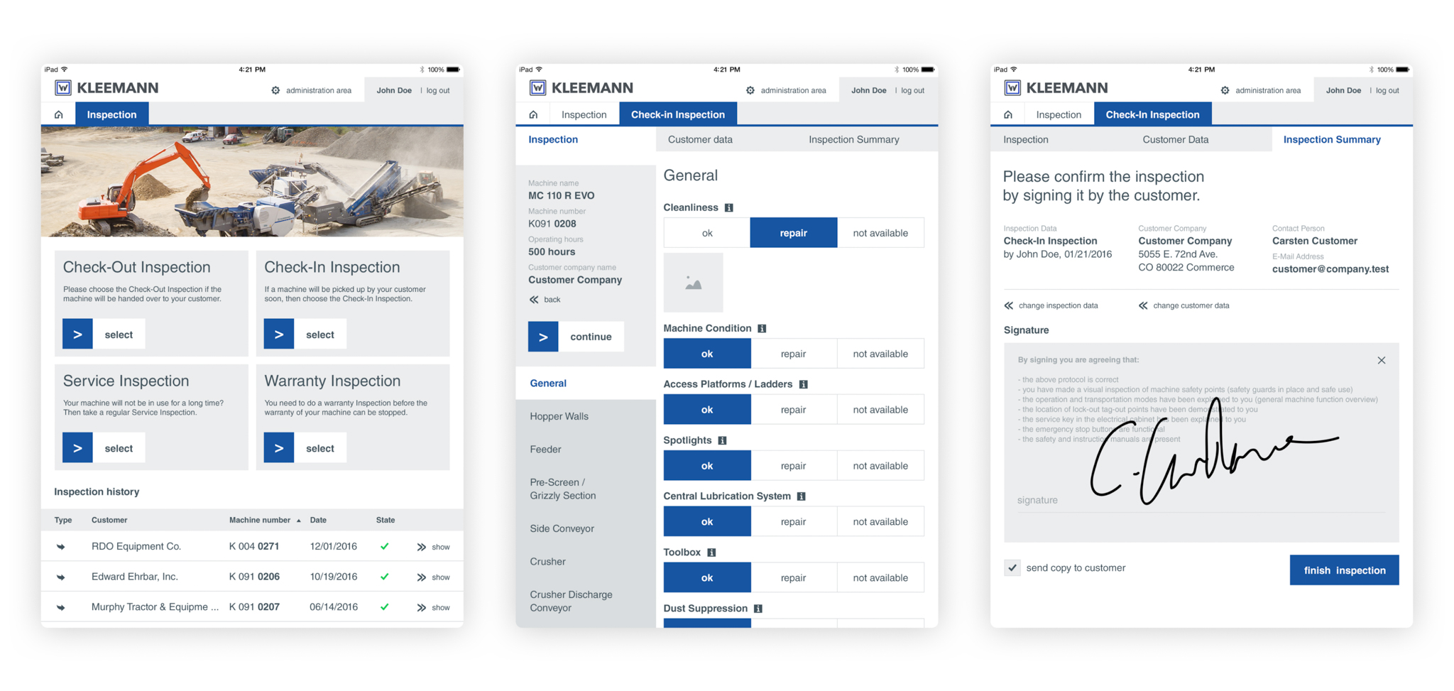 Die Durchführung von Inspektionen ist einer der Kernprozesse im Tagesgeschäft der Händler und stellt daher auch den Hauptanwendungszweck der App dar. Die Nutzerin/ der Nutzer wählen zunächst die Maschine, für die eine Inspektion durchgeführt wird. Die App erkennt automatisch aufgrund der zuletzt durchgeführten Inspektionen, dass es sich um eine Check-in- oder eine Check-out -Inspektion handelt. Auf den folgenden Seiten findet die Nutzerin/ der Nutzer nun verschiedene Prüfpunkte in unterschiedlichen Kategorien. Es können erklärende Bilder und Kommentare zu jeden Prüfpunkt hinzugefügt werden. Sobald alle Prüfpunkte abgeschlossen wurden, werden auf der folgenden Seite Kontaktinformationen aufgenommen, bis dann schließlich die Inspektion vom Kunden als Bestätigung digital signiert und abschließend ein PDF aus der Inspektion generiert wird. Ein wesentlicher Aspekt der Vereinfachung des Inspektionsprozesses war die Vereinheitlichung der Checklisten. Auch die Reihenfolge der Prüfpunkte orientieren sich an der natürlichen Begehung der Nutzer*innen während der Inspektion. Die App erlaubt außerdem den Vergleich mit der letzten Inspektion. So sind Abweichungen zwischen Check-in und Check-out der Maschinen auf einen Blick ersichtlich. Auch der Synchronisierungsprozess in Zusammenhang mit der Offline-Funktionalität als Must-Have-Feature wurden in der App berücksichtigt.