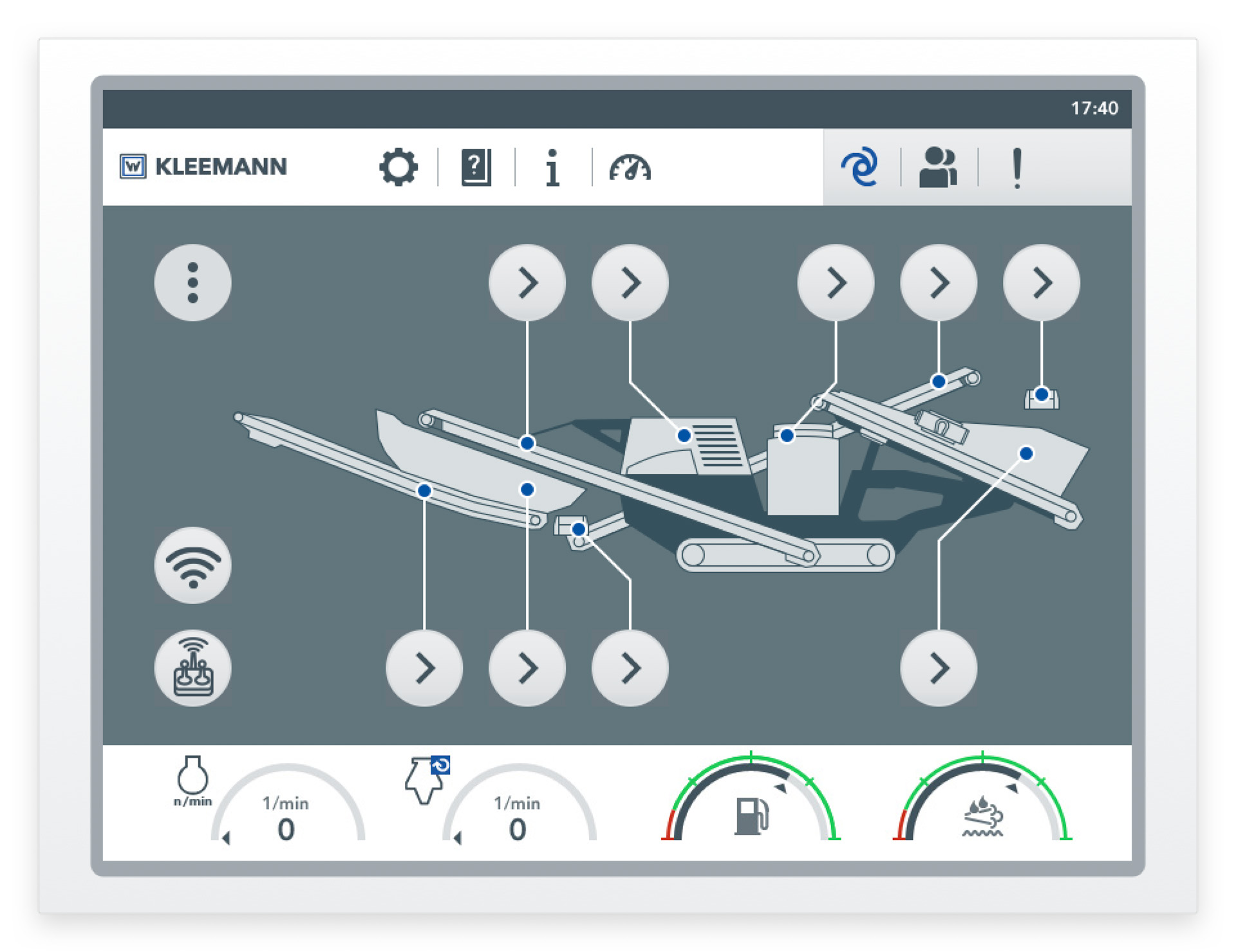 Kleemann ist ein Unternehmen der Wirtgen Group, einem international tätigen Unternehmensverbund der Baumaschinenindustrie und ist Hersteller von mobilen Brechanlagen und Sieben. Die Brechanlagen werden für die Aufbereitung bzw. zerkleinern von großen Gesteinen im Steinbruch oder auf Baustellen eingesetzt. Das Endprodukt wird dann zum Beispiel für die weitere Verarbeitung im Straßenbau verwendet. Abhängig vom Ausgangsmaterial und gewünschten Endprodukt kommen unterschiedliche Brecherarten in unterschiedlichen Konfigurationen zum Einsatz. Die Anlagen werden über ein Touchinterface und Bedientastern an der Maschine und zusätzlichen Funkfernbedienungen gesteuert. Das sich dahinter verbergende Steuerungskonzept heißt SPECTIVE und wurde durch uns stark geprägt.