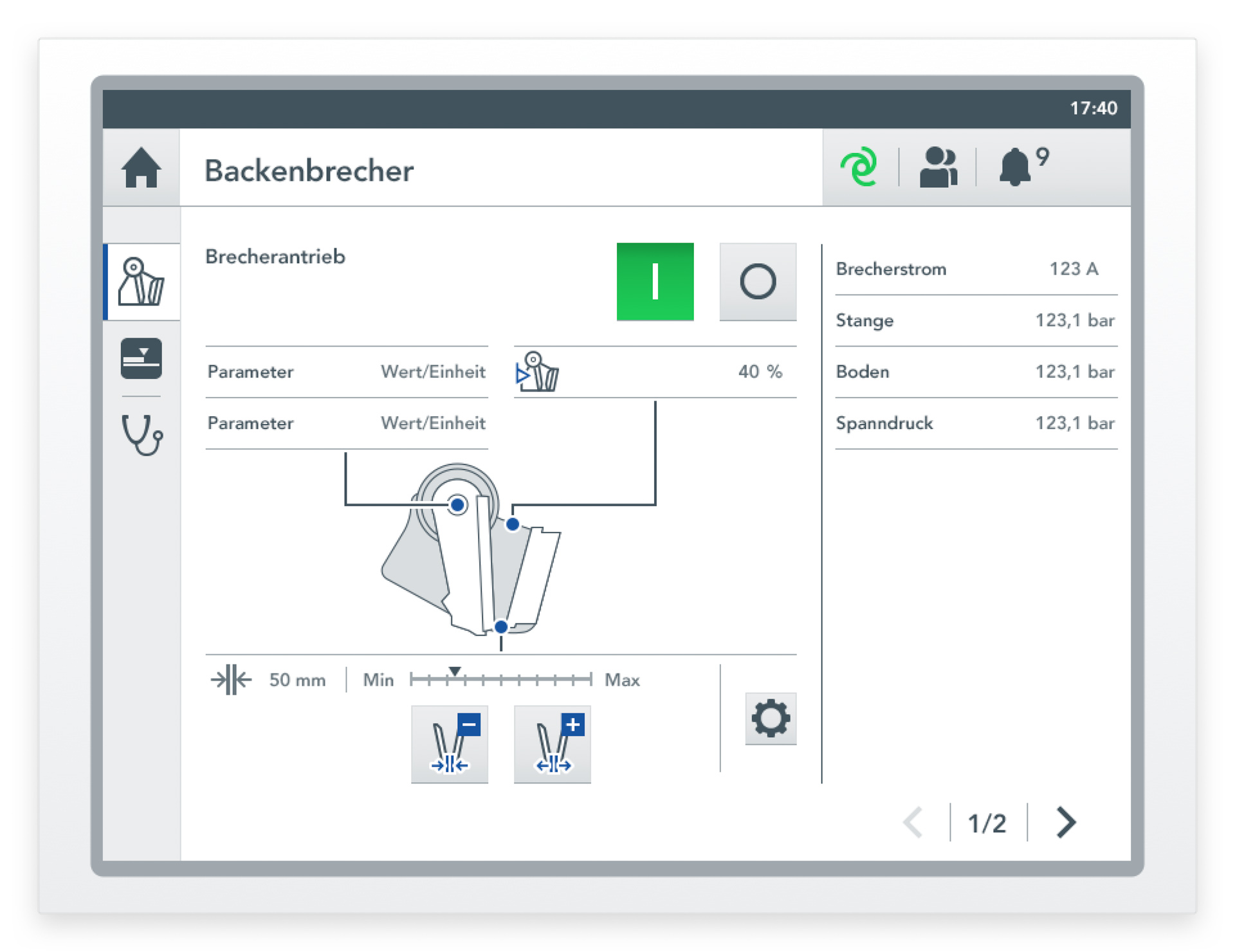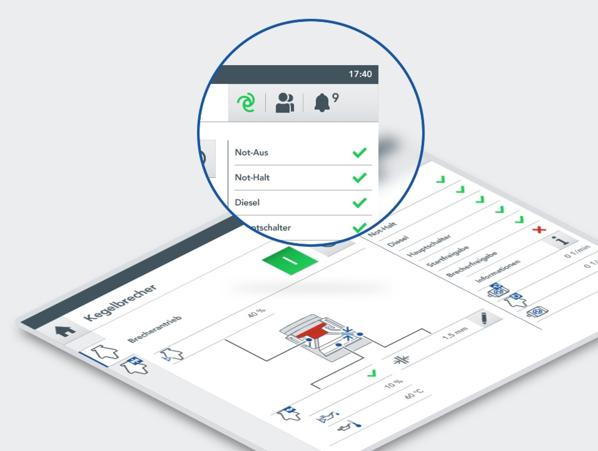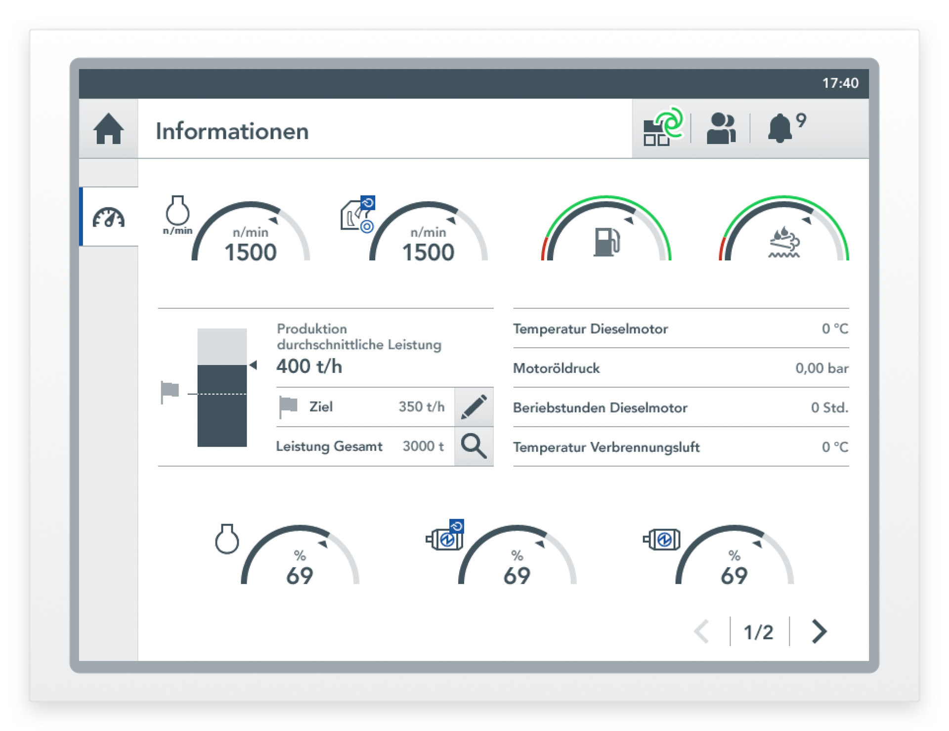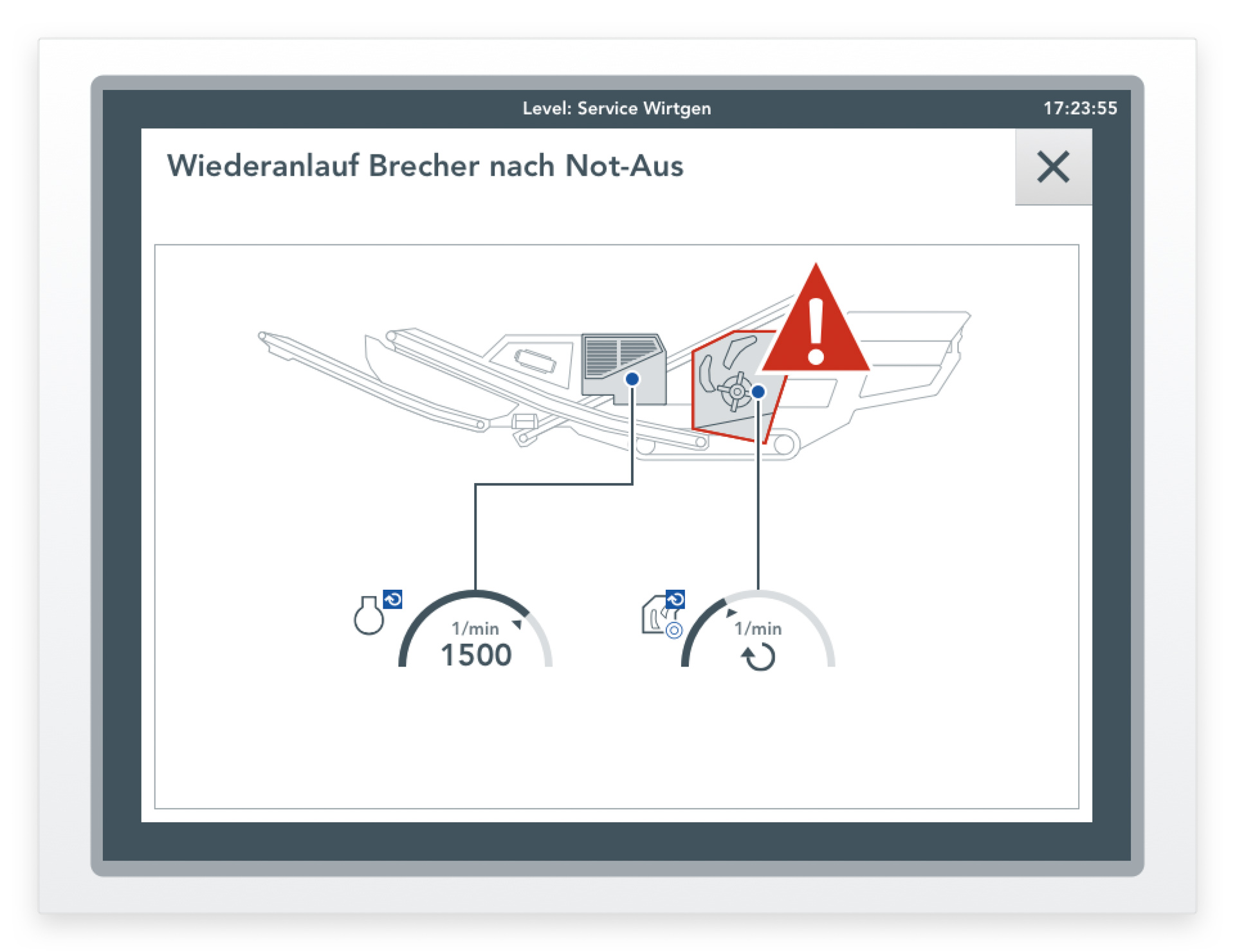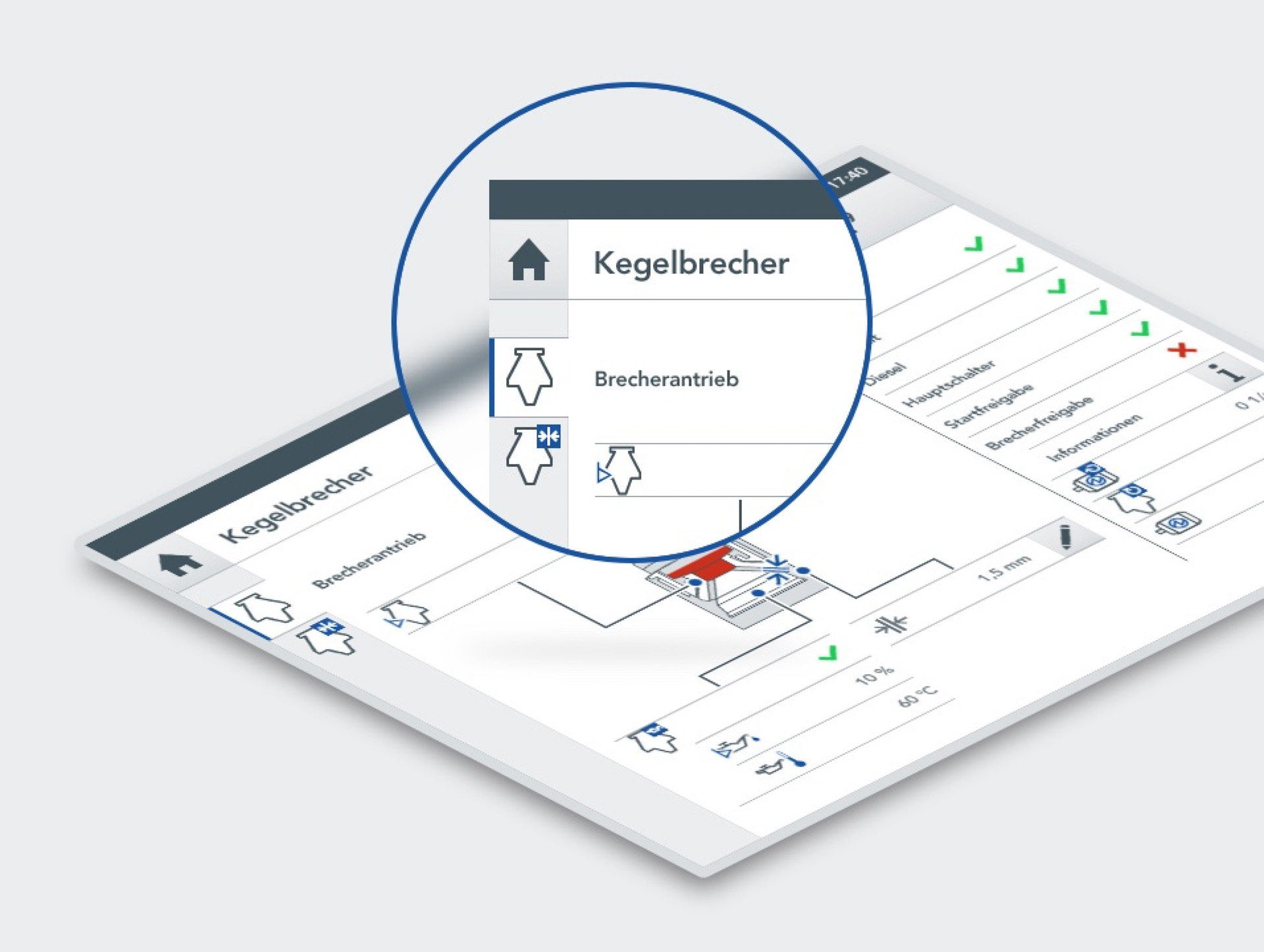 Der Nutzer steuert die Maschine über das 12” große Display seitlich an der Brechanlage. Durch User Research und Kontextanalysen an den Einsatzorten der Anlagen auf Baustellen oder in Steinbrüchen identifizierten wir die Anforderungen an das Interface. Wechselnde Tages- und Lichtverhältnisse erforderten ein gut durchdachtes Farbkonzept. Eine einfache Bedienung musste auch noch mit großen und zusätzlich durch Handschuhe geschützten Hände möglich sein und auch die Gestaltung von Inhalten sollte sehr einfach verständlich und möglichst sprachneutral erklärt werden um alle Nutzergruppen anzusprechen und Sicherheit in der Bedienung zu erzeugen. Gleichzeitig soll ein fahrlässiger oder fehlerhafte Umgang mit der Maschine UI gestützt reduziert bzw. vermieden werden, um so Verschleiß oder Schäden an der Anlage zu vermeiden, die mit hohen Reparaturkosten verbunden sind. So soll der Nutzer stets einen Überblick über seine Anlage haben, Abweichungen sofort erkennen können und durch die Fehlerbehebung geführt werden.