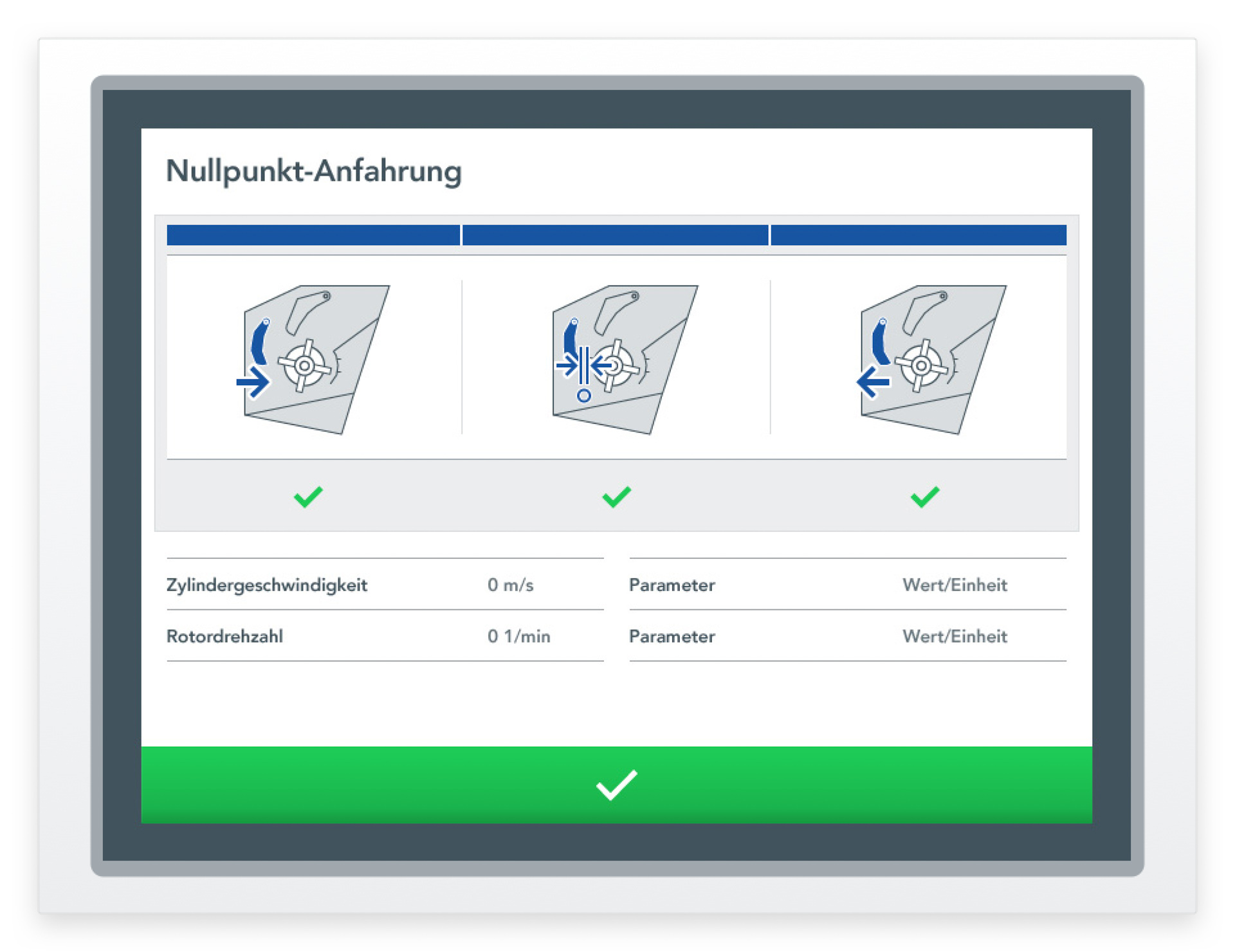 Direkt beim Start hilft eine bebilderte Schrittabfolge dabei, die Anlage in einen betriebsbereiten Modus zu versetzen. Eine einfache Navigationsstruktur erhöht die User Experience des Produktes, indem sie den Nutzer dabei unterstützt, Parameter im Produktionsbetrieb effizient einzustellen und im Dashboard zu überwachen. Eine übersichtliche Startseite erleichtert den Einstieg in einzelne Gewerke. Zur Navigation auf Unterseiten der Steuerung kommt eine seitlich angeordnete Navigation zum Einsatz. Über Registerkarten kann zwischen verschiedenen Seiten im Gewerk gewechselt werden. Ein Home-Button ermöglicht es zudem, jederzeit bequem zur Startseite zu gelangen. Eine Funktionsleiste sichert den konsistenten Zugang zu übergreifenden Funktionen und einer Übersicht mit Status- und Fehlermeldungen. Wichtige Kennzahlen und Informationen werden in diagrammatischen Darstellungen und einer Abbildung der Anlage präsentiert. Ein erweitertes Dashboard ermöglicht zudem eine kompakte Zusammenfassung mit Informationen zur aktuellen Auslastung.