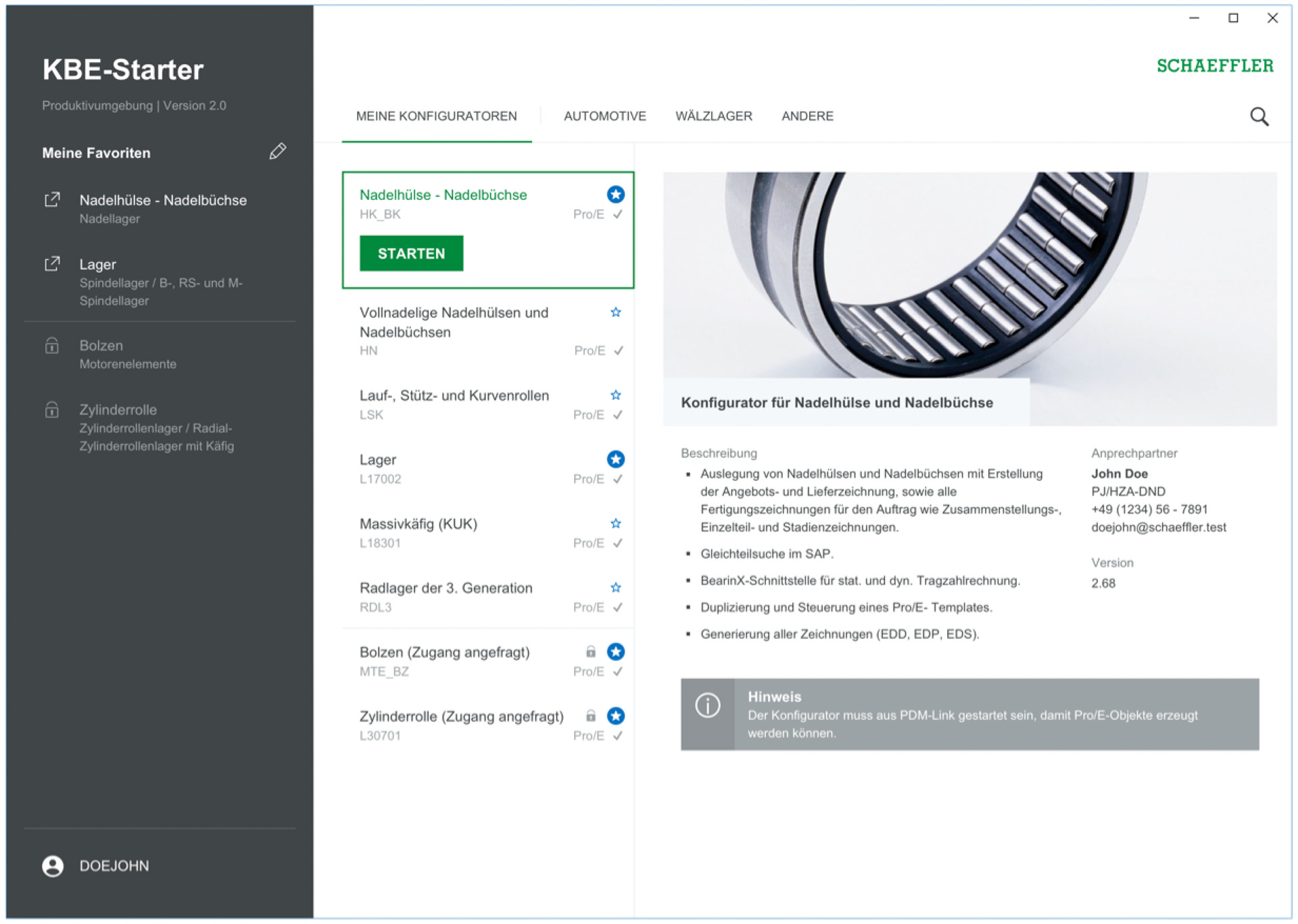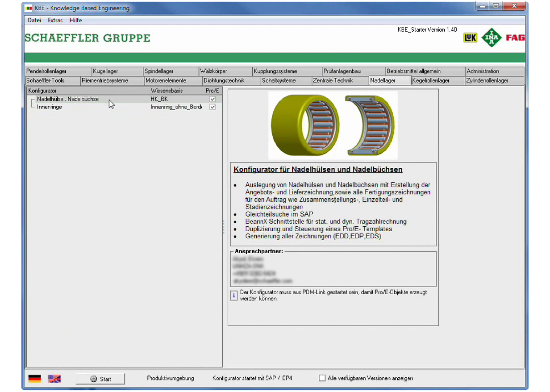 Die Schaeffler Gruppe ist ein weltweit agierender Automobil- und Industriezulieferer mit Stammsitz in Herzogenaurach. Zum umfassenden Portfolio an Technologielösungen zählen auch die Fertigung- und Konfiguration individualisierter Wälz- und Gleitlagern. Die Konfiguration solcher Wälz- und Gleitlager erfolgt innerhalb der, von inzwischen mehr als 80 existierenden, hoch spezialisierten und auf Camos-Technologie basierenden Produktkonfiguratoren. Diese werden seit der Entwicklung des ersten Konfigurators kontinuierlich weiterentwickelt und stetig kommen neue hinzu. Zusammengehalten werden die Konfiguratoren von einem einheitlichen Rahmen, dem s.g. KBE-Framework.