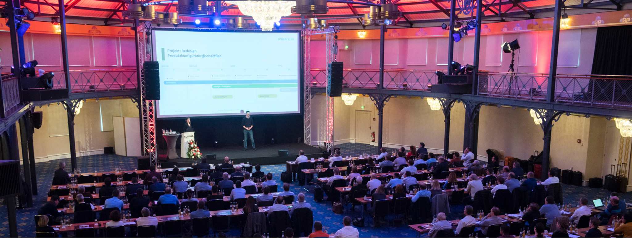 Die Ergebnisse aus dem Redesign der Produktkonfiguratoren war Inspiration und Anlass das Thema UX in Konfiguratoren der Camos-Community und einem breiteren Publikum vorzustellen. Unter dem Titel Redesign ProductConfigurators@Schaeffler präsentierten wir zusammen mit Schaeffler auf großer Bühne im Maritim Hotel Stuttgart Insights, Erfahrungen und das neue Design der Produktkonfiguratoren und beleuchteten dabei essentielle Aspekte einer guten Gestaltung. In einer folgenden von Schaeffler organisierten internen Vortragsreihe, dem KBE Usermeeting, sind wir als Gastredner nach Herzogenaurach eingeladen worden und weckten einmal mehr die Aufmerksamkeit für gutes und organisiertes Design am Beispiel einer fiktiven Schaeffler Kantinen-App.